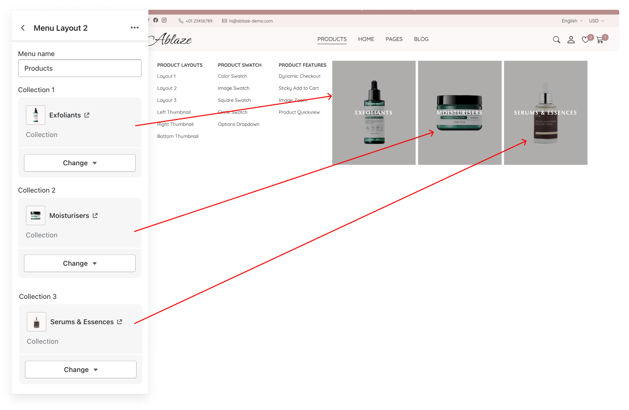 This theme supports both a standard 3 tier dropdown navigation and full-width mega menu. The mega menu navigation offers a choice of three unique layouts, which can be selected in the theme navigation section.